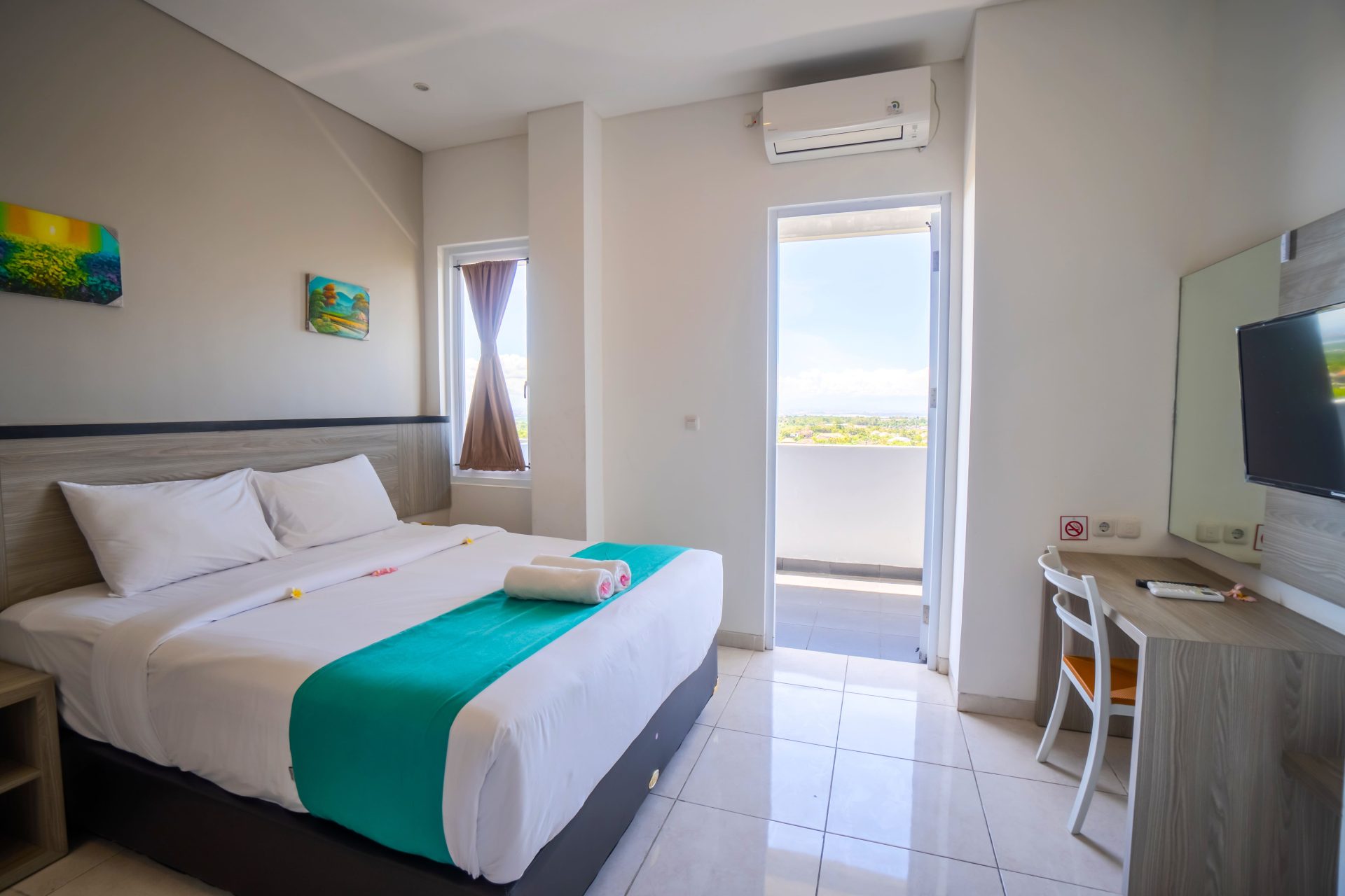 Each room is equipped with a kettle, work desk, and flat-screen TV, with selected rooms offering a private balcony for added comfort.